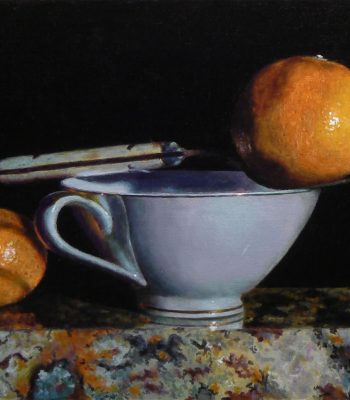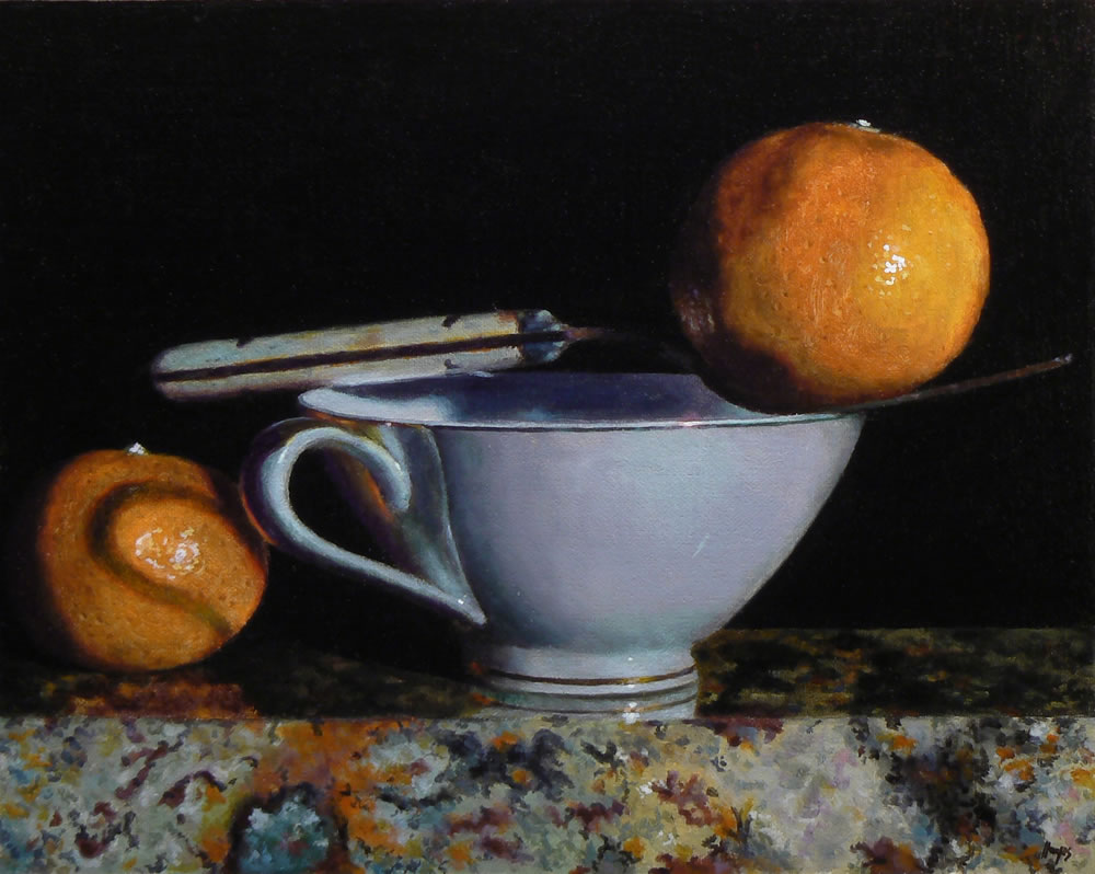 “Teacup, Fork, and Two Oranges on Granite”, oil on linen, 8×10 inches, 2012, Sold