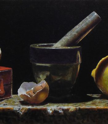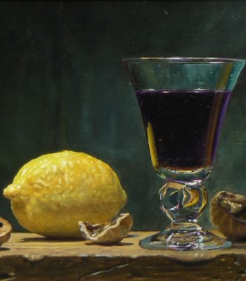 “Walnuts, Lemon, and Wine”, oil on linen, 7×10 inches, 2011, Sold