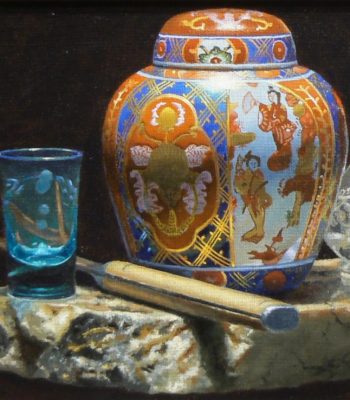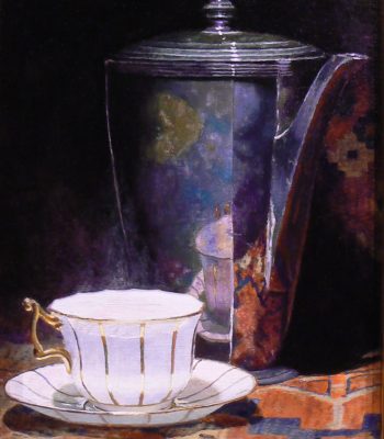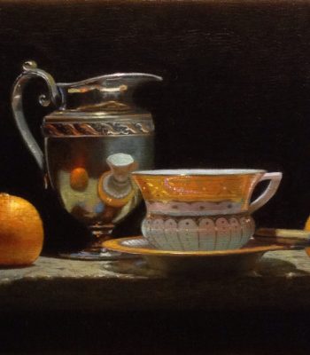 “Teacup and Teapot on an Oriental Rug”, oil on linen, 10×8 inches, 2012, Sold
