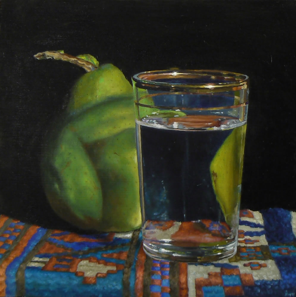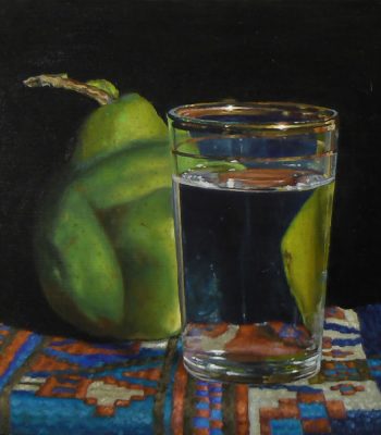 “Creamer, Bottle, and Pear”, oil on linen, 9×12 inches, 2014, Sold
