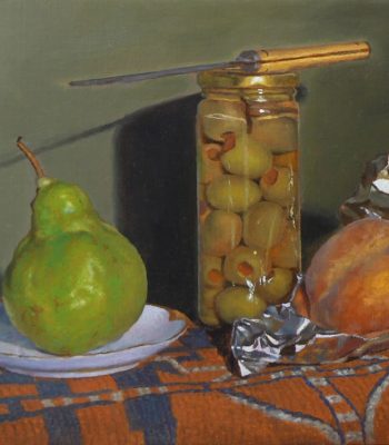 “Pear, Olives, Knife, and Peach”, oil on linen, 9×12 inches, 2014, Sold