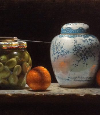 “Contemplation: Oranges, Olives, Ginger Jar”, oil on linen, 9×12 inches, 2017, Sold