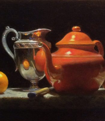 “Contemplation: Oranges, Silver, and Red Teapot”, oil on linen, 9×12 inches, 2017, Sold
