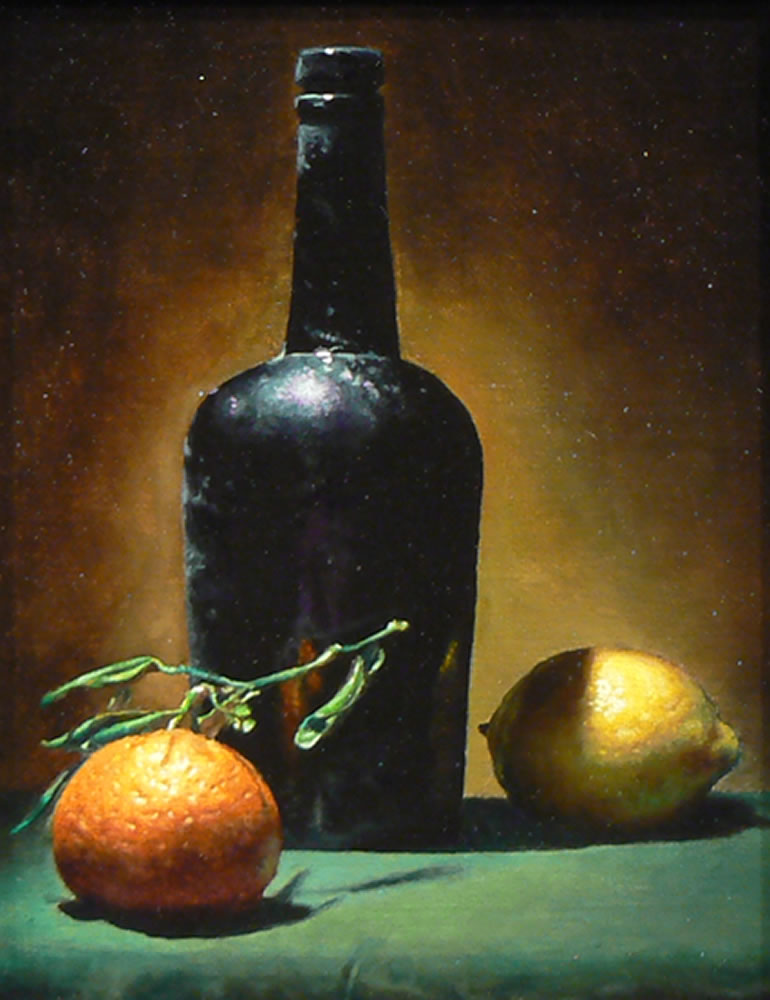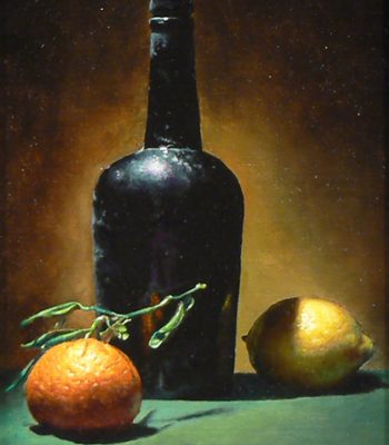 “Antique Bottle, Seville Orange, and Lemon”, oil on linen, 10×8 inches, 2012, Sold