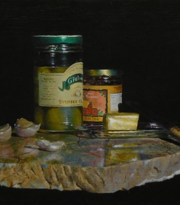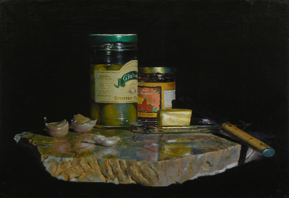 “Garlic, Olives, Tomatoes, Butter”, oil on linen, 11×16 inches, 2012, Available