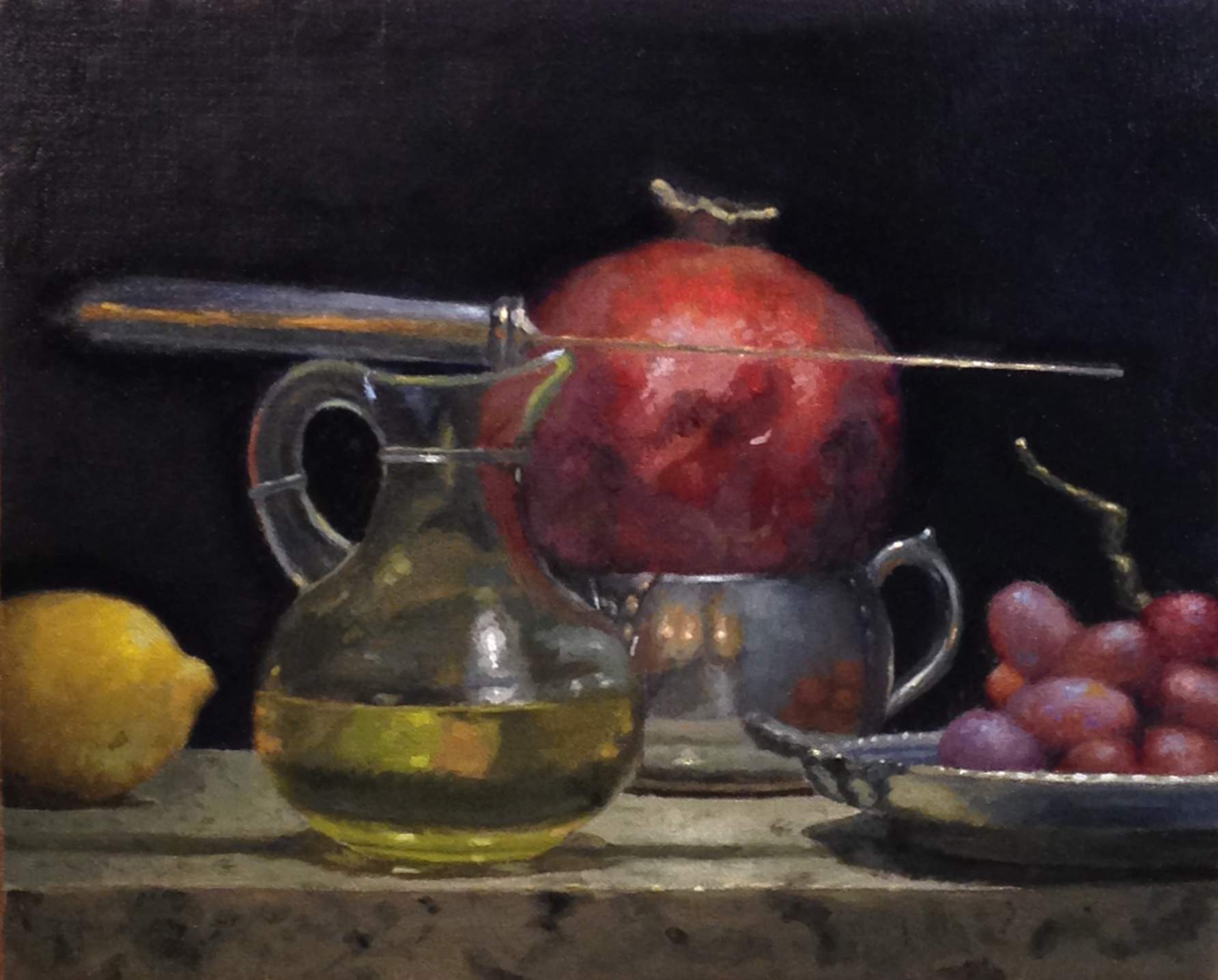 “Still Life with Knife and Pomegranate”, oil on linen, 8×10 inches, 2018, Available