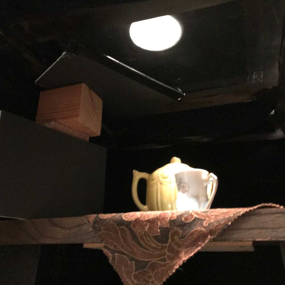 Though not easy to see from this angle, the blocks in the upper left are supporting a piece of black foam board. This was positioned several inches below the opening, and creates a shadow that cuts across the teapot at at dramatic angle.